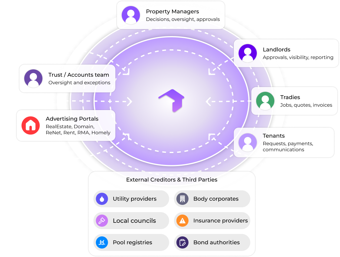 OurProperty brings property management professionals, landlords, tenants, tradies and financial counterparties into a single platform where information, decisions and actions flow seamlessly, removing handovers, duplication and disconnected tools.
