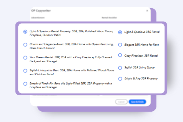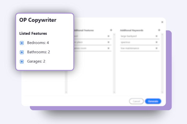 Here’s how it works: OurProperty’s AI copywriter pulls the property details you’ve already entered into the system and turns them into compelling, ready-to-publish listings in just a few clicks.