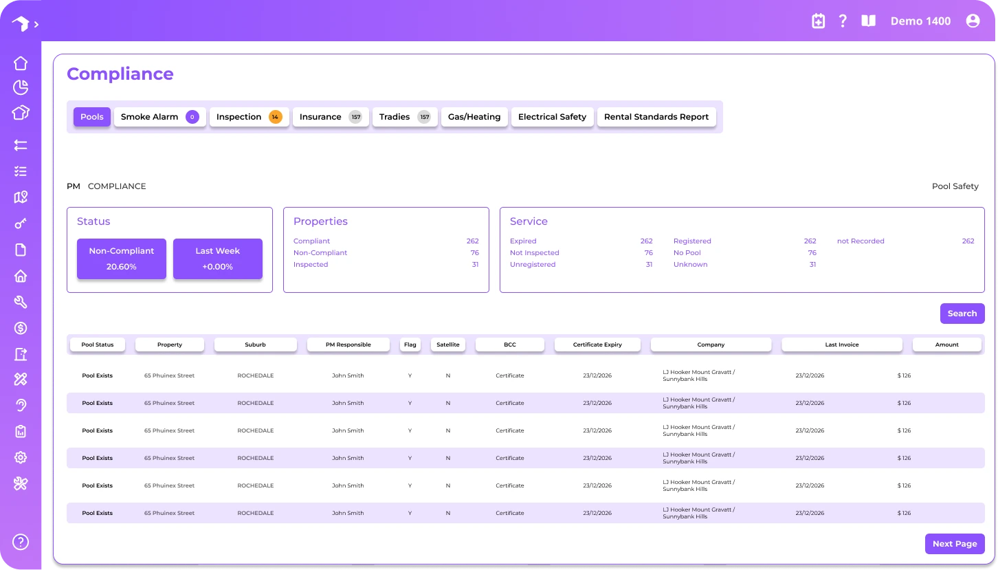 View the compliance status of all properties in a single dashboard. See compliant vs. non-compliant properties for smoke alarms, pool safety, gas, electrical, insurance, and routine inspections—keeping you informed at a glance.
