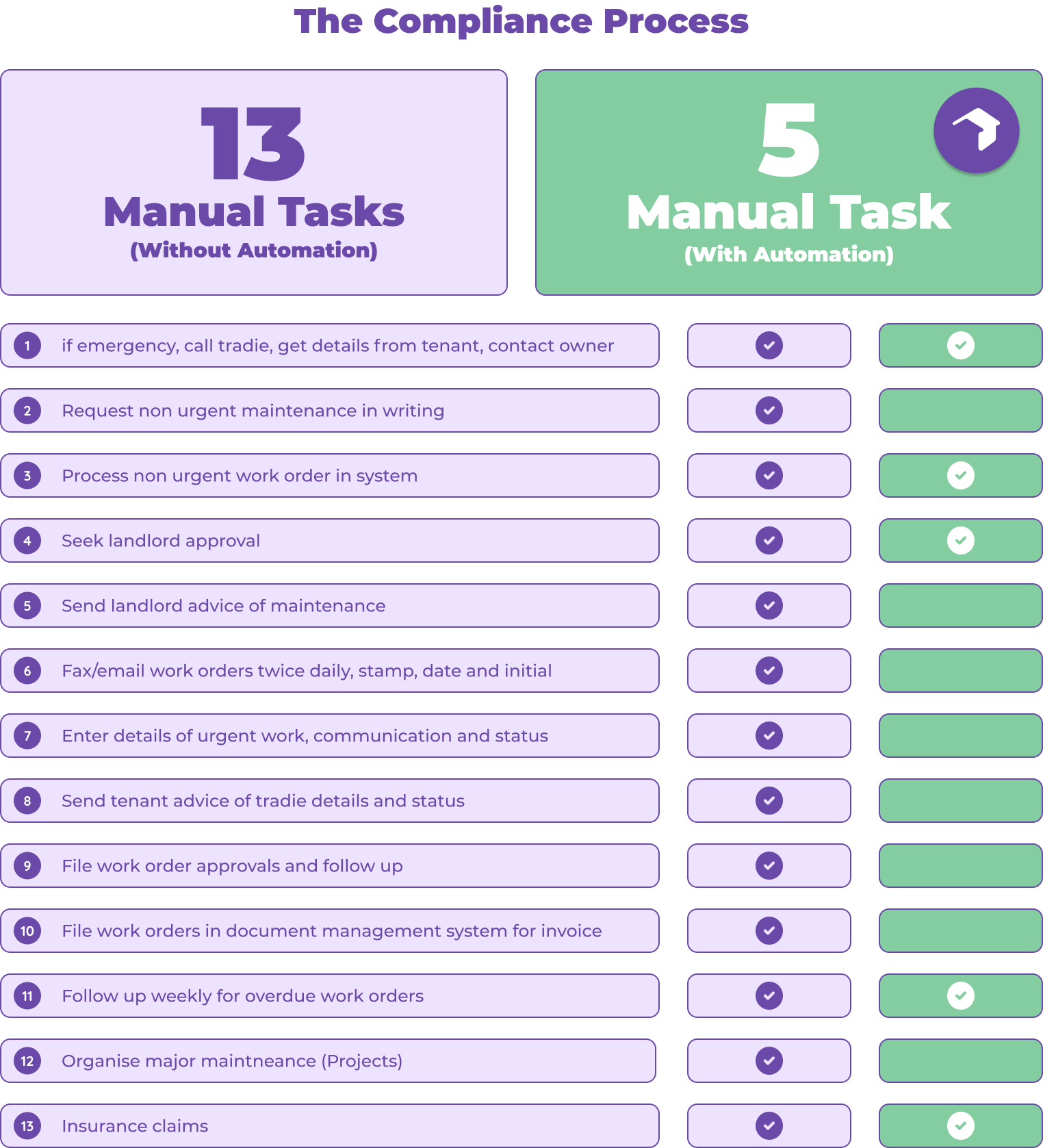 Managing compliance across multiple properties takes time, and missing a requirement can lead to costly risks. OurProperty streamlines compliance by automating smoke alarm inspections, tracking key safety checks, and centralising records. With built-in reporting, automated reminders, and seamless integrations, you’ll have full visibility over every compliance requirement—without the admin burden.
