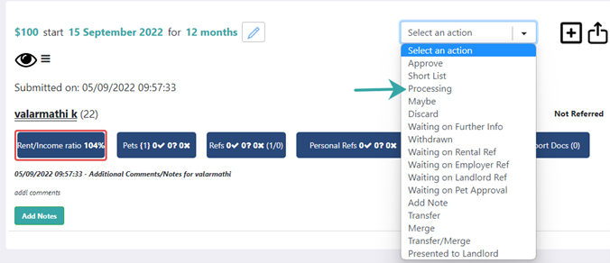 A new action has been added to the drop-down menu on submitted applications labelled ‘Processing’. When selected, an email will send to the applicants to advise their application has been received and is being processed by the agency. You can find and edit the email template in your agency settings > Lettings tab > Email Settings Tab > Processing Application Notification to Tenant.