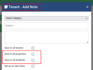 Tenant Notes added via the tenant card can now be automatically applied to the Landlord and/or Property cards when creating the note. These tick box options eliminate any need for double handling and ensure note visibility across all areas of the Client Hub.