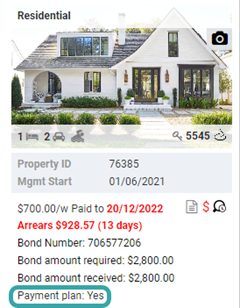 The property card now displays if the tenants are on a rental payment plan to pay off arrears. This will simply show ‘YES’ if a payment plan is in place, and you can review the payment plan details via the Arrears Report, Rental Payment Plan.