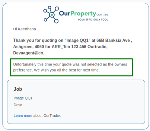 A small change has been made to the rejected quote email template sent to the tradie when the owner proceeds with an alternative option. The message now states that ‘the quote was not selected as the owners preference’.