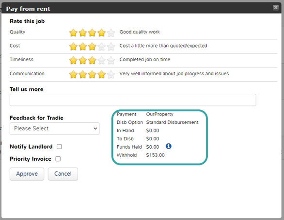 For owners being paid via OurProperty Payments, you will now see a summary of the property financial balances when approving a maintenance invoice for payment from Rent. This allows for improved visibility on current available funds and a greater understanding of when the invoice will be paid to the tradie. Alternatively, if you see the owner has no available funds for payment you can request funds from the Landlord for any invoices that may be urgent.