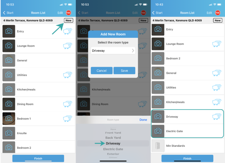 Two (2) new room categories have been added to the PM Inspect App for ‘Driveway’ & ‘Electric Gate’. These rooms can be added to the Room List by pressing on New and selecting either or both options from the list of rooms provided in the scroll menu. Both new options sit at the bottom of the scroll list.